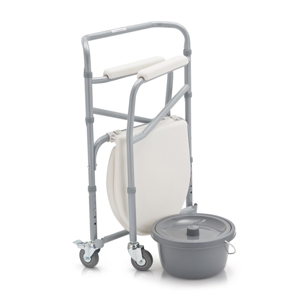 Грузоподъемность составляет 110 кг, для комфорта установлены пластмассовые подлокотники. Кресло-туалет оснащено устойчивыми к различным повреждениям колесами с тормозами на задней паре, позволяющим эффективно транспортировать реабилитируемого и фиксировать устройство.