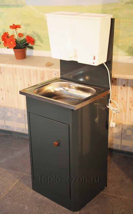 Если на даче не оборудовано централизованное водоснабжение, можно воспользоваться умывальником Садко ЭВН. Его конструкция легко собирается из отдельных деталей – рукомойника, мойки и тумбочки-подставки с дверцей. Имеется также электронагревательный элемент, позволяющий получать горячую воду.