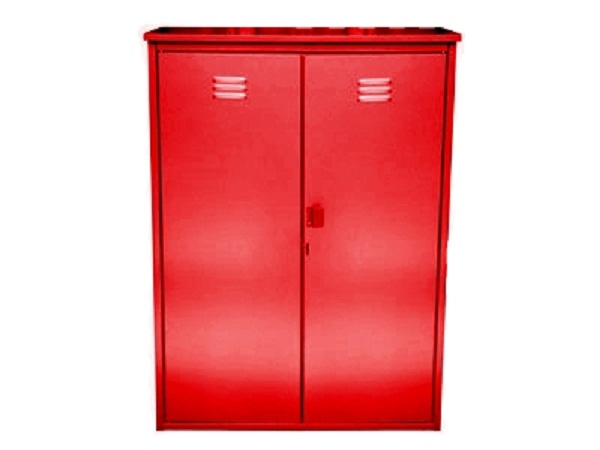 Шкаф, изготовленный для хранения 2-х газовых баллонов – практичное, технологичное изделие, которое часто используется в хозяйстве и на строительных объектах. Выполнен он в ярко красном цвете, что сигнализирует о том, что внутри хранятся горючие, опасные вещества.